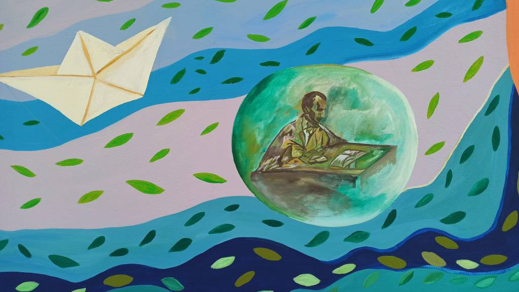 Στον κεντρικό τοίχο έχουμε τη Γνώση. Από την μια πλευρά βρίσκεται ένα απλό δέντρο κι από την άλλη ένα δέντρο με καρπούς. Χρειάζεται ένα ολόκληρο ταξίδι (το οποίο απεικονίζεται στα μαλλιά της κοπέλας)για να φτάσει κανείς απέναντι στο καρποφόρο δέντρο, το οποίο συμβαίνει μέσα από τις σαπουνόφουσκες. Στις σαπουνόφουσκες υπάρχουν κομμάτια της ιστορίας και της λογοτεχνίας για να δείξουν τον δρόμο. Συγκεκριμένα, ο Καζαντζάκης, η Ολυμπία και η αρχαία Ήλιδα (ως χαρακτηριστικά μνημεία της τοπικής ιστορίας).
